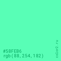 Цвет #58FEB6 в цветовой модели RGB обозначается тремя октетами (88, 254, 182) в десятичном формате и #58FEB6 в шестнадцатиричном (hex) формате, которые являются интенсивностью красного 88 (hex 58), интенсивность зелёного 254 (hex FE) и интенсивность синего 182 (hex B6).