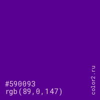 Цвет #590093 в цветовой модели RGB обозначается тремя октетами (89, 0, 147) в десятичном формате и #590093 в шестнадцатиричном (hex) формате, которые являются интенсивностью красного 89 (hex 59), интенсивность зелёного 0 (hex 00) и интенсивность синего 147 (hex 93).
