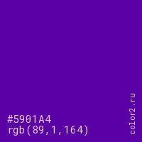 Цвет #5901A4 в цветовой модели RGB обозначается тремя октетами (89, 1, 164) в десятичном формате и #5901A4 в шестнадцатиричном (hex) формате, которые являются интенсивностью красного 89 (hex 59), интенсивность зелёного 1 (hex 01) и интенсивность синего 164 (hex A4).
