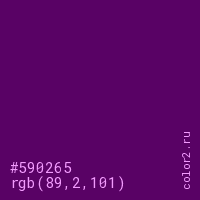 Цвет #590265 в цветовой модели RGB обозначается тремя октетами (89, 2, 101) в десятичном формате и #590265 в шестнадцатиричном (hex) формате, которые являются интенсивностью красного 89 (hex 59), интенсивность зелёного 2 (hex 02) и интенсивность синего 101 (hex 65).