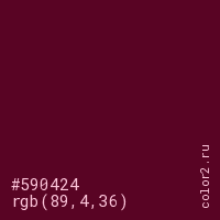Цвет #590424 в цветовой модели RGB обозначается тремя октетами (89, 4, 36) в десятичном формате и #590424 в шестнадцатиричном (hex) формате, которые являются интенсивностью красного 89 (hex 59), интенсивность зелёного 4 (hex 04) и интенсивность синего 36 (hex 24).
