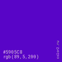 Цвет #5905C8 в цветовой модели RGB обозначается тремя октетами (89, 5, 200) в десятичном формате и #5905C8 в шестнадцатиричном (hex) формате, которые являются интенсивностью красного 89 (hex 59), интенсивность зелёного 5 (hex 05) и интенсивность синего 200 (hex C8).