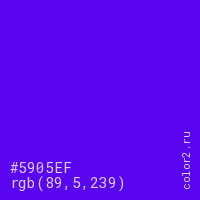 Цвет #5905EF в цветовой модели RGB обозначается тремя октетами (89, 5, 239) в десятичном формате и #5905EF в шестнадцатиричном (hex) формате, которые являются интенсивностью красного 89 (hex 59), интенсивность зелёного 5 (hex 05) и интенсивность синего 239 (hex EF).