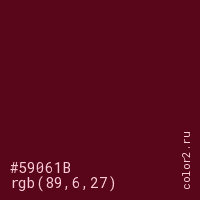 Цвет #59061B в цветовой модели RGB обозначается тремя октетами (89, 6, 27) в десятичном формате и #59061B в шестнадцатиричном (hex) формате, которые являются интенсивностью красного 89 (hex 59), интенсивность зелёного 6 (hex 06) и интенсивность синего 27 (hex 1B).