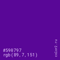 Цвет #590797 в цветовой модели RGB обозначается тремя октетами (89, 7, 151) в десятичном формате и #590797 в шестнадцатиричном (hex) формате, которые являются интенсивностью красного 89 (hex 59), интенсивность зелёного 7 (hex 07) и интенсивность синего 151 (hex 97).