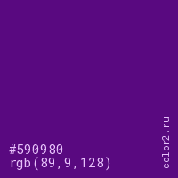 Цвет #590980 в цветовой модели RGB обозначается тремя октетами (89, 9, 128) в десятичном формате и #590980 в шестнадцатиричном (hex) формате, которые являются интенсивностью красного 89 (hex 59), интенсивность зелёного 9 (hex 09) и интенсивность синего 128 (hex 80).
