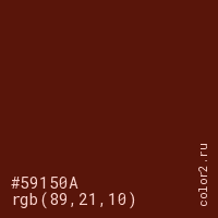 Цвет #59150A в цветовой модели RGB обозначается тремя октетами (89, 21, 10) в десятичном формате и #59150A в шестнадцатиричном (hex) формате, которые являются интенсивностью красного 89 (hex 59), интенсивность зелёного 21 (hex 15) и интенсивность синего 10 (hex 0A).