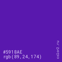 Цвет #5918AE в цветовой модели RGB обозначается тремя октетами (89, 24, 174) в десятичном формате и #5918AE в шестнадцатиричном (hex) формате, которые являются интенсивностью красного 89 (hex 59), интенсивность зелёного 24 (hex 18) и интенсивность синего 174 (hex AE).