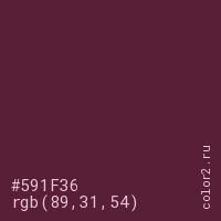 Цвет #591F36 в цветовой модели RGB обозначается тремя октетами (89, 31, 54) в десятичном формате и #591F36 в шестнадцатиричном (hex) формате, которые являются интенсивностью красного 89 (hex 59), интенсивность зелёного 31 (hex 1F) и интенсивность синего 54 (hex 36).