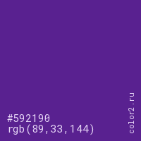 Цвет #592190 в цветовой модели RGB обозначается тремя октетами (89, 33, 144) в десятичном формате и #592190 в шестнадцатиричном (hex) формате, которые являются интенсивностью красного 89 (hex 59), интенсивность зелёного 33 (hex 21) и интенсивность синего 144 (hex 90).