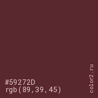Цвет #59272D в цветовой модели RGB обозначается тремя октетами (89, 39, 45) в десятичном формате и #59272D в шестнадцатиричном (hex) формате, которые являются интенсивностью красного 89 (hex 59), интенсивность зелёного 39 (hex 27) и интенсивность синего 45 (hex 2D).
