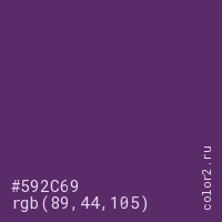 Цвет #592C69 в цветовой модели RGB обозначается тремя октетами (89, 44, 105) в десятичном формате и #592C69 в шестнадцатиричном (hex) формате, которые являются интенсивностью красного 89 (hex 59), интенсивность зелёного 44 (hex 2C) и интенсивность синего 105 (hex 69).