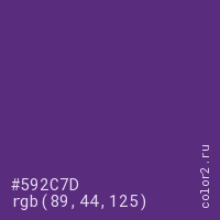Цвет #592C7D в цветовой модели RGB обозначается тремя октетами (89, 44, 125) в десятичном формате и #592C7D в шестнадцатиричном (hex) формате, которые являются интенсивностью красного 89 (hex 59), интенсивность зелёного 44 (hex 2C) и интенсивность синего 125 (hex 7D).