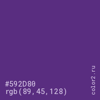 Цвет #592D80 в цветовой модели RGB обозначается тремя октетами (89, 45, 128) в десятичном формате и #592D80 в шестнадцатиричном (hex) формате, которые являются интенсивностью красного 89 (hex 59), интенсивность зелёного 45 (hex 2D) и интенсивность синего 128 (hex 80).