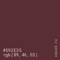 Цвет #592E35 в цветовой модели RGB обозначается тремя октетами (89, 46, 53) в десятичном формате и #592E35 в шестнадцатиричном (hex) формате, которые являются интенсивностью красного 89 (hex 59), интенсивность зелёного 46 (hex 2E) и интенсивность синего 53 (hex 35).