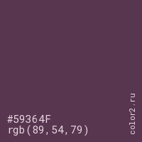 Цвет #59364F в цветовой модели RGB обозначается тремя октетами (89, 54, 79) в десятичном формате и #59364F в шестнадцатиричном (hex) формате, которые являются интенсивностью красного 89 (hex 59), интенсивность зелёного 54 (hex 36) и интенсивность синего 79 (hex 4F).