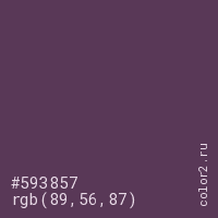 Цвет #593857 в цветовой модели RGB обозначается тремя октетами (89, 56, 87) в десятичном формате и #593857 в шестнадцатиричном (hex) формате, которые являются интенсивностью красного 89 (hex 59), интенсивность зелёного 56 (hex 38) и интенсивность синего 87 (hex 57).