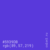 Цвет #5939DB в цветовой модели RGB обозначается тремя октетами (89, 57, 219) в десятичном формате и #5939DB в шестнадцатиричном (hex) формате, которые являются интенсивностью красного 89 (hex 59), интенсивность зелёного 57 (hex 39) и интенсивность синего 219 (hex DB).