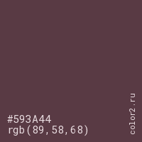 Цвет #593A44 в цветовой модели RGB обозначается тремя октетами (89, 58, 68) в десятичном формате и #593A44 в шестнадцатиричном (hex) формате, которые являются интенсивностью красного 89 (hex 59), интенсивность зелёного 58 (hex 3A) и интенсивность синего 68 (hex 44).