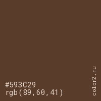 Цвет #593C29 в цветовой модели RGB обозначается тремя октетами (89, 60, 41) в десятичном формате и #593C29 в шестнадцатиричном (hex) формате, которые являются интенсивностью красного 89 (hex 59), интенсивность зелёного 60 (hex 3C) и интенсивность синего 41 (hex 29).