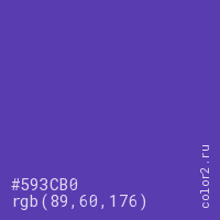 Цвет #593CB0 в цветовой модели RGB обозначается тремя октетами (89, 60, 176) в десятичном формате и #593CB0 в шестнадцатиричном (hex) формате, которые являются интенсивностью красного 89 (hex 59), интенсивность зелёного 60 (hex 3C) и интенсивность синего 176 (hex B0).