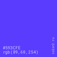 Цвет #593CFE в цветовой модели RGB обозначается тремя октетами (89, 60, 254) в десятичном формате и #593CFE в шестнадцатиричном (hex) формате, которые являются интенсивностью красного 89 (hex 59), интенсивность зелёного 60 (hex 3C) и интенсивность синего 254 (hex FE).