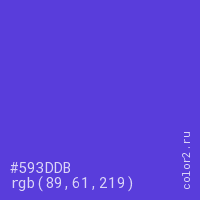 Цвет #593DDB в цветовой модели RGB обозначается тремя октетами (89, 61, 219) в десятичном формате и #593DDB в шестнадцатиричном (hex) формате, которые являются интенсивностью красного 89 (hex 59), интенсивность зелёного 61 (hex 3D) и интенсивность синего 219 (hex DB).