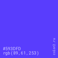 Цвет #593DFD в цветовой модели RGB обозначается тремя октетами (89, 61, 253) в десятичном формате и #593DFD в шестнадцатиричном (hex) формате, которые являются интенсивностью красного 89 (hex 59), интенсивность зелёного 61 (hex 3D) и интенсивность синего 253 (hex FD).