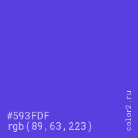 Цвет #593FDF в цветовой модели RGB обозначается тремя октетами (89, 63, 223) в десятичном формате и #593FDF в шестнадцатиричном (hex) формате, которые являются интенсивностью красного 89 (hex 59), интенсивность зелёного 63 (hex 3F) и интенсивность синего 223 (hex DF).