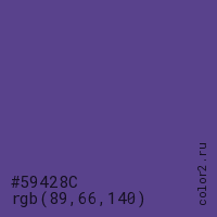 Цвет #59428C в цветовой модели RGB обозначается тремя октетами (89, 66, 140) в десятичном формате и #59428C в шестнадцатиричном (hex) формате, которые являются интенсивностью красного 89 (hex 59), интенсивность зелёного 66 (hex 42) и интенсивность синего 140 (hex 8C).