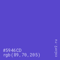Цвет #5946CD в цветовой модели RGB обозначается тремя октетами (89, 70, 205) в десятичном формате и #5946CD в шестнадцатиричном (hex) формате, которые являются интенсивностью красного 89 (hex 59), интенсивность зелёного 70 (hex 46) и интенсивность синего 205 (hex CD).