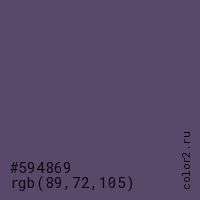 Цвет #594869 в цветовой модели RGB обозначается тремя октетами (89, 72, 105) в десятичном формате и #594869 в шестнадцатиричном (hex) формате, которые являются интенсивностью красного 89 (hex 59), интенсивность зелёного 72 (hex 48) и интенсивность синего 105 (hex 69).