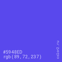 Цвет #5948ED в цветовой модели RGB обозначается тремя октетами (89, 72, 237) в десятичном формате и #5948ED в шестнадцатиричном (hex) формате, которые являются интенсивностью красного 89 (hex 59), интенсивность зелёного 72 (hex 48) и интенсивность синего 237 (hex ED).