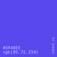 Цвет #5948EE в цветовой модели RGB обозначается тремя октетами (89, 72, 238) в десятичном формате и #5948EE в шестнадцатиричном (hex) формате, которые являются интенсивностью красного 89 (hex 59), интенсивность зелёного 72 (hex 48) и интенсивность синего 238 (hex EE).