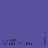 Цвет #59509F в цветовой модели RGB обозначается тремя октетами (89, 80, 159) в десятичном формате и #59509F в шестнадцатиричном (hex) формате, которые являются интенсивностью красного 89 (hex 59), интенсивность зелёного 80 (hex 50) и интенсивность синего 159 (hex 9F).