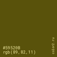 Цвет #59520B в цветовой модели RGB обозначается тремя октетами (89, 82, 11) в десятичном формате и #59520B в шестнадцатиричном (hex) формате, которые являются интенсивностью красного 89 (hex 59), интенсивность зелёного 82 (hex 52) и интенсивность синего 11 (hex 0B).
