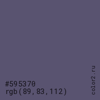 Цвет #595370 в цветовой модели RGB обозначается тремя октетами (89, 83, 112) в десятичном формате и #595370 в шестнадцатиричном (hex) формате, которые являются интенсивностью красного 89 (hex 59), интенсивность зелёного 83 (hex 53) и интенсивность синего 112 (hex 70).