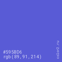 Цвет #595BD6 в цветовой модели RGB обозначается тремя октетами (89, 91, 214) в десятичном формате и #595BD6 в шестнадцатиричном (hex) формате, которые являются интенсивностью красного 89 (hex 59), интенсивность зелёного 91 (hex 5B) и интенсивность синего 214 (hex D6).