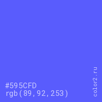 Цвет #595CFD в цветовой модели RGB обозначается тремя октетами (89, 92, 253) в десятичном формате и #595CFD в шестнадцатиричном (hex) формате, которые являются интенсивностью красного 89 (hex 59), интенсивность зелёного 92 (hex 5C) и интенсивность синего 253 (hex FD).