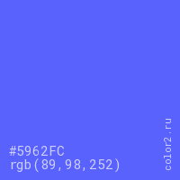 Цвет #5962FC в цветовой модели RGB обозначается тремя октетами (89, 98, 252) в десятичном формате и #5962FC в шестнадцатиричном (hex) формате, которые являются интенсивностью красного 89 (hex 59), интенсивность зелёного 98 (hex 62) и интенсивность синего 252 (hex FC).