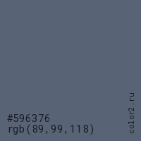Цвет #596376 в цветовой модели RGB обозначается тремя октетами (89, 99, 118) в десятичном формате и #596376 в шестнадцатиричном (hex) формате, которые являются интенсивностью красного 89 (hex 59), интенсивность зелёного 99 (hex 63) и интенсивность синего 118 (hex 76).