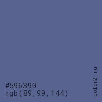 Цвет #596390 в цветовой модели RGB обозначается тремя октетами (89, 99, 144) в десятичном формате и #596390 в шестнадцатиричном (hex) формате, которые являются интенсивностью красного 89 (hex 59), интенсивность зелёного 99 (hex 63) и интенсивность синего 144 (hex 90).