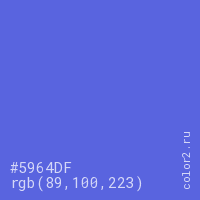 Цвет #5964DF в цветовой модели RGB обозначается тремя октетами (89, 100, 223) в десятичном формате и #5964DF в шестнадцатиричном (hex) формате, которые являются интенсивностью красного 89 (hex 59), интенсивность зелёного 100 (hex 64) и интенсивность синего 223 (hex DF).