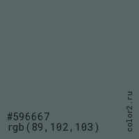 Цвет #596667 в цветовой модели RGB обозначается тремя октетами (89, 102, 103) в десятичном формате и #596667 в шестнадцатиричном (hex) формате, которые являются интенсивностью красного 89 (hex 59), интенсивность зелёного 102 (hex 66) и интенсивность синего 103 (hex 67).