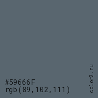 Цвет #59666F в цветовой модели RGB обозначается тремя октетами (89, 102, 111) в десятичном формате и #59666F в шестнадцатиричном (hex) формате, которые являются интенсивностью красного 89 (hex 59), интенсивность зелёного 102 (hex 66) и интенсивность синего 111 (hex 6F).