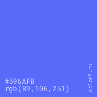 Цвет #596AFB в цветовой модели RGB обозначается тремя октетами (89, 106, 251) в десятичном формате и #596AFB в шестнадцатиричном (hex) формате, которые являются интенсивностью красного 89 (hex 59), интенсивность зелёного 106 (hex 6A) и интенсивность синего 251 (hex FB).