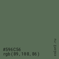 Цвет #596C56 в цветовой модели RGB обозначается тремя октетами (89, 108, 86) в десятичном формате и #596C56 в шестнадцатиричном (hex) формате, которые являются интенсивностью красного 89 (hex 59), интенсивность зелёного 108 (hex 6C) и интенсивность синего 86 (hex 56).