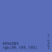 Цвет #596DB9 в цветовой модели RGB обозначается тремя октетами (89, 109, 185) в десятичном формате и #596DB9 в шестнадцатиричном (hex) формате, которые являются интенсивностью красного 89 (hex 59), интенсивность зелёного 109 (hex 6D) и интенсивность синего 185 (hex B9).