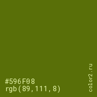 Цвет #596F08 в цветовой модели RGB обозначается тремя октетами (89, 111, 8) в десятичном формате и #596F08 в шестнадцатиричном (hex) формате, которые являются интенсивностью красного 89 (hex 59), интенсивность зелёного 111 (hex 6F) и интенсивность синего 8 (hex 08).