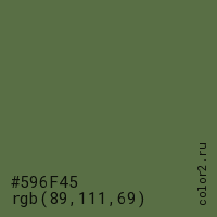 Цвет #596F45 в цветовой модели RGB обозначается тремя октетами (89, 111, 69) в десятичном формате и #596F45 в шестнадцатиричном (hex) формате, которые являются интенсивностью красного 89 (hex 59), интенсивность зелёного 111 (hex 6F) и интенсивность синего 69 (hex 45).